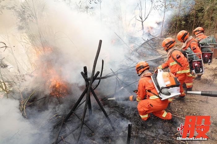 图为消防救援人员演练使用水枪扑灭山火。李青山 摄